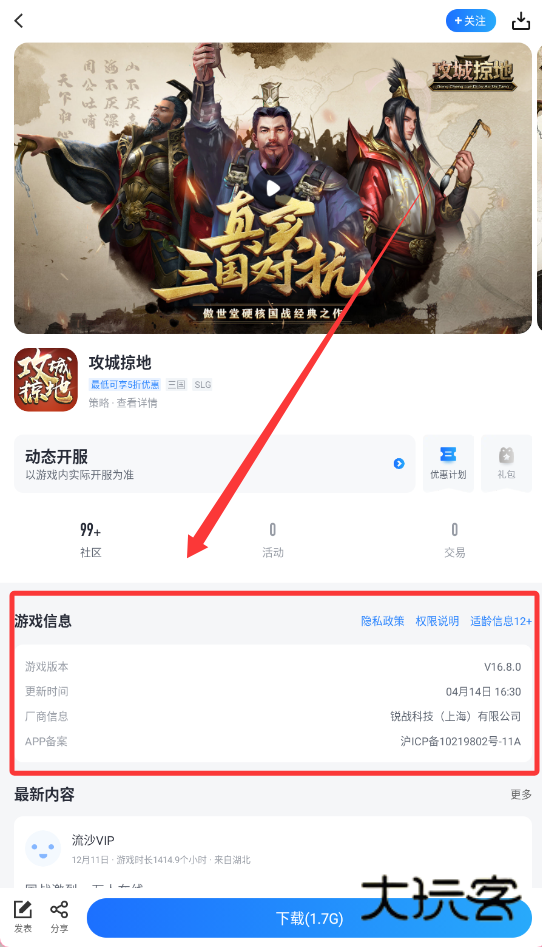 3、然后,在游戏信息区域确认版本、更新与备案等内容,确保下载安全可靠。