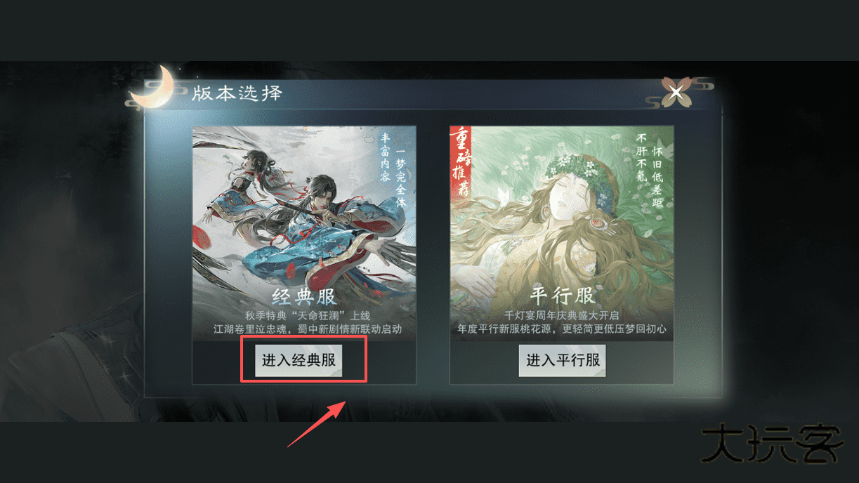 1、选择服务器时,可以在主界面点击右上角“切换平行服”按钮,或者于版本选择界面,根据版本特色与活动自行点选经典服或平行服进入。