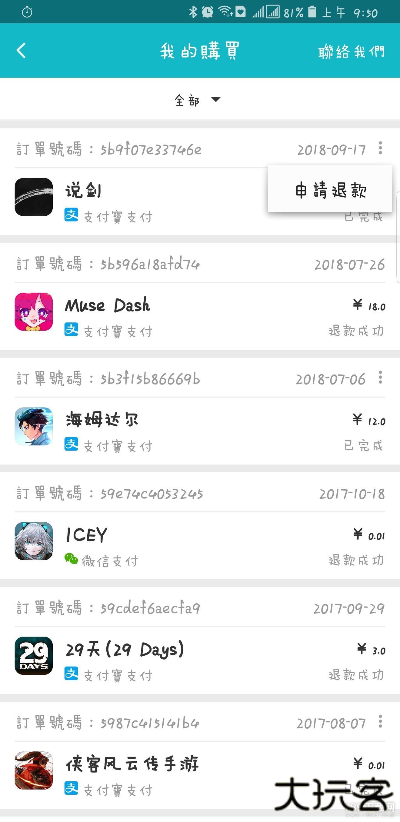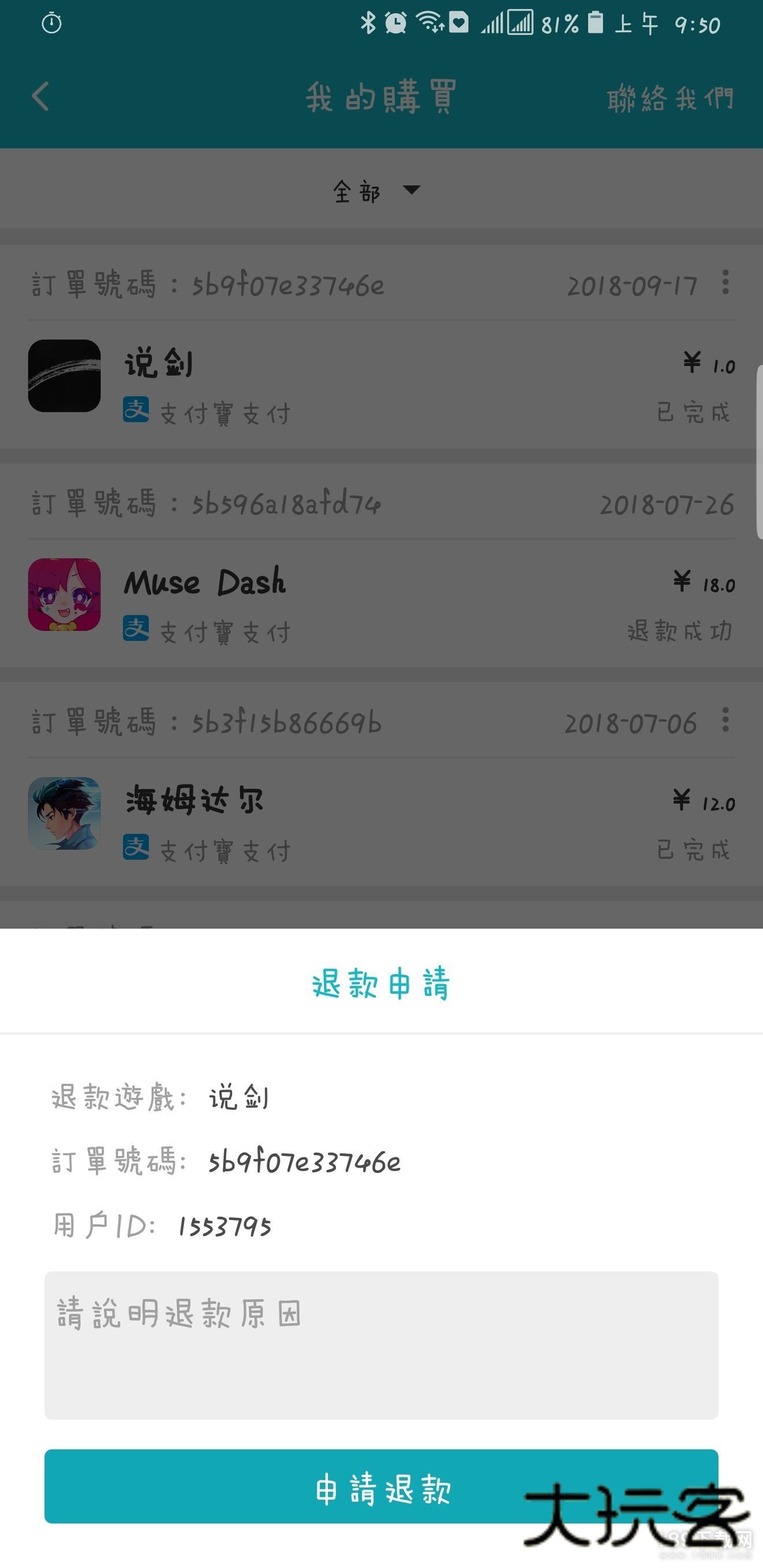 2.在订单管理页面中可以看到自己曾经在TapTap购买的游戏,点击账单页右上角的按钮会弹出“申请退款”弹框