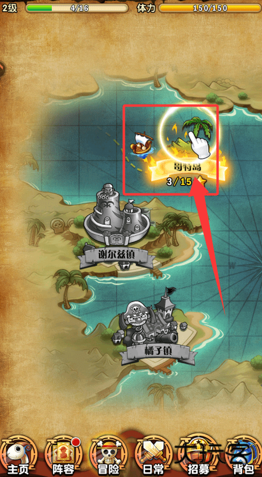 2、通过冒险界面选择并挑战已解锁的城镇关卡。例如“谢尔兹镇”或“橘子镇”,每次成功探索不仅推进剧情,还能收获经验与素材,是提升角色等级的主要途径。