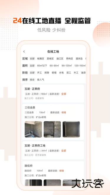 旷远e家由诚信入驻装企提供高品质施工服务,平台专业监理提供过程质量把控,在线工地全城在线直播!