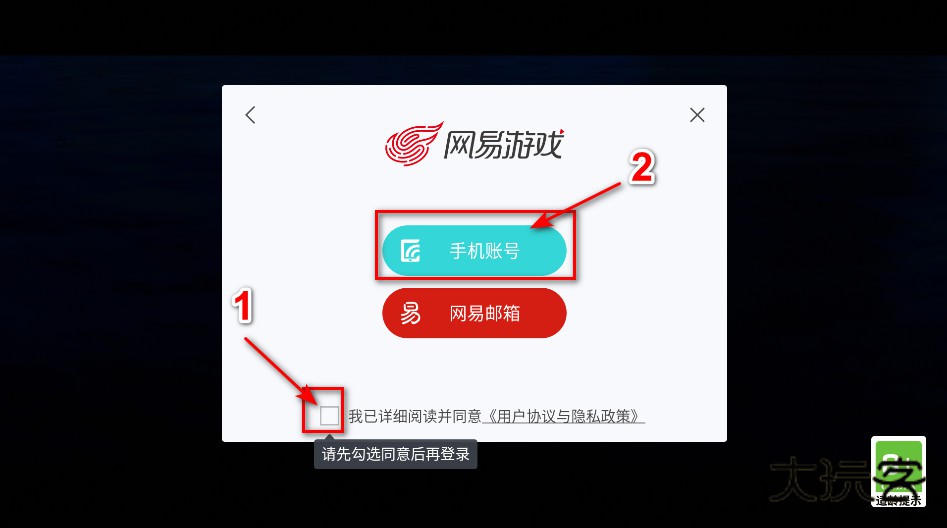 5.这里我们先点击同意“用户协议与隐私政策”,然后再输入手机账号,或者网易邮箱,后面就跟正常的登录游戏一样啦!