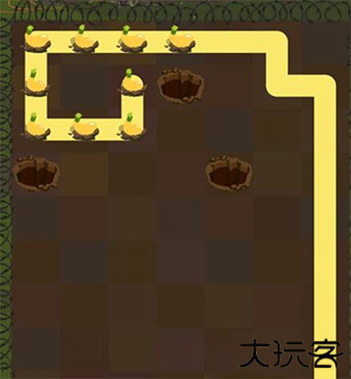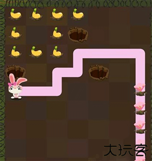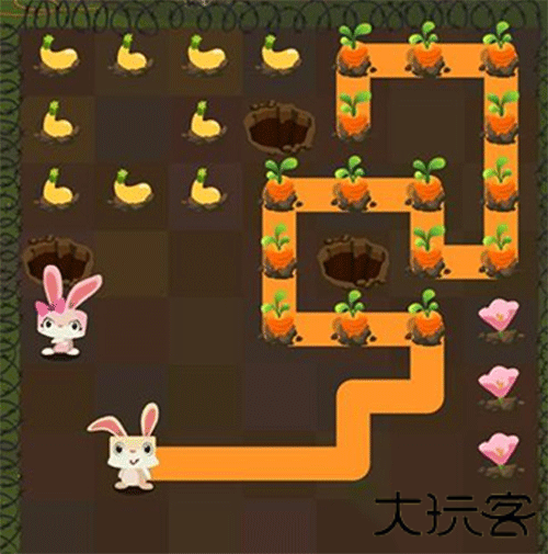 2、接着轮到小兔子行动,按照图片所示路线移动,吃掉胡萝卜,顺利抵达洞口。