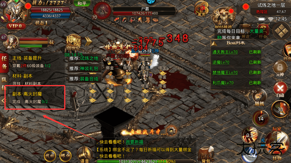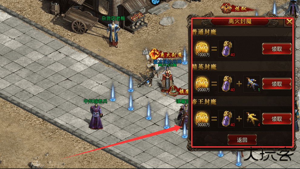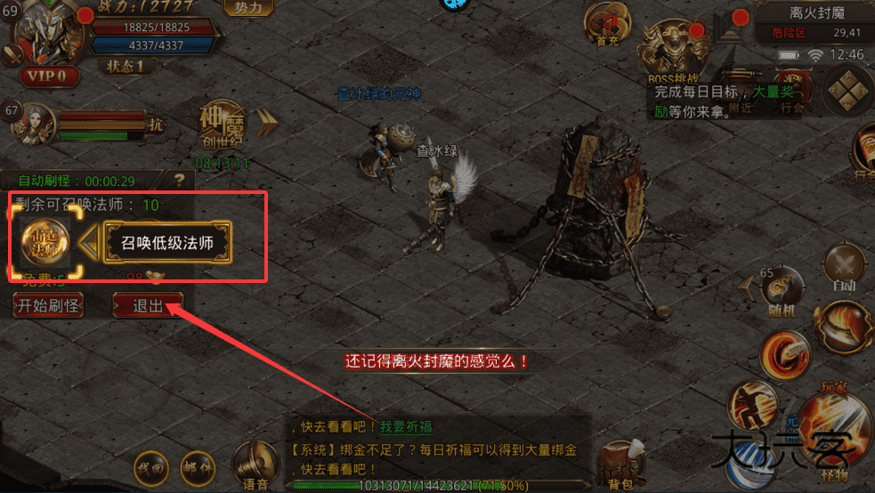 2、每日可找杂货店老板进入离火封魔副本,69级可进入,有6分钟时间召唤法师帮你打怪拿大量经验。