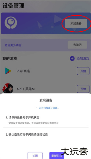 3、设备配对简单三步 :先开设备电源(看到蓝色呼吸灯慢闪) ,点 APP 里的「添加设备」按钮开始扫描 看到手柄图标出现在设备列表就点它完成连接。