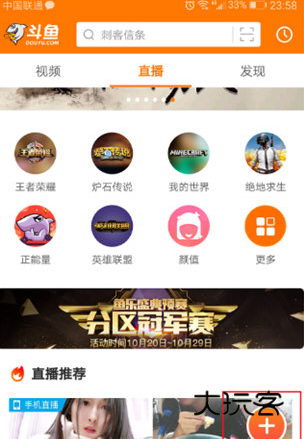 1、在手机上打开斗鱼APP,进去首页,点击右侧的“+”,如下图所示,