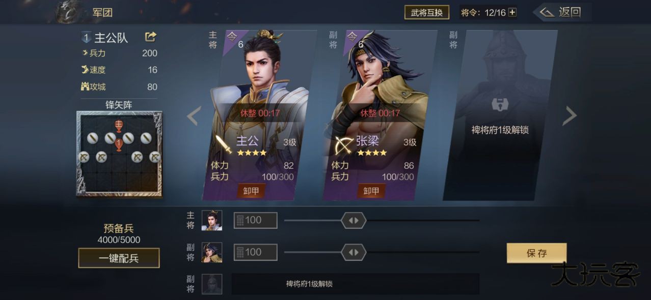 在军团系统中玩家可以调整阵容,武将的站位、阵型以及兵力等不同配置,注意将领的上场受到将令的限制,而升级主公府和虎符都可以提高将领值度。