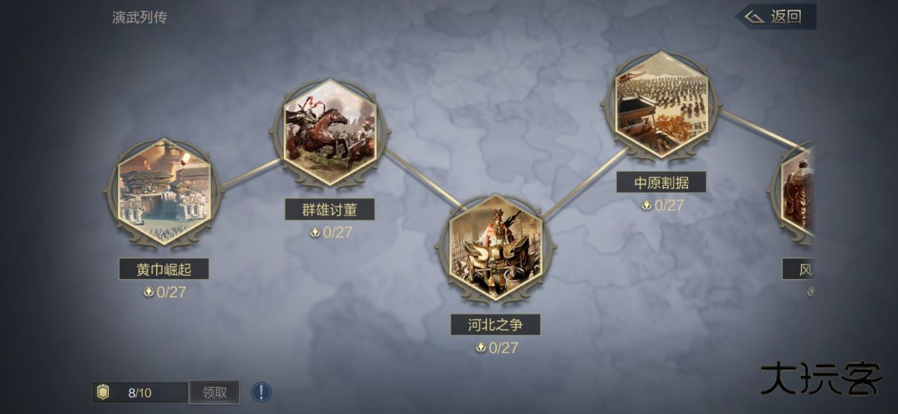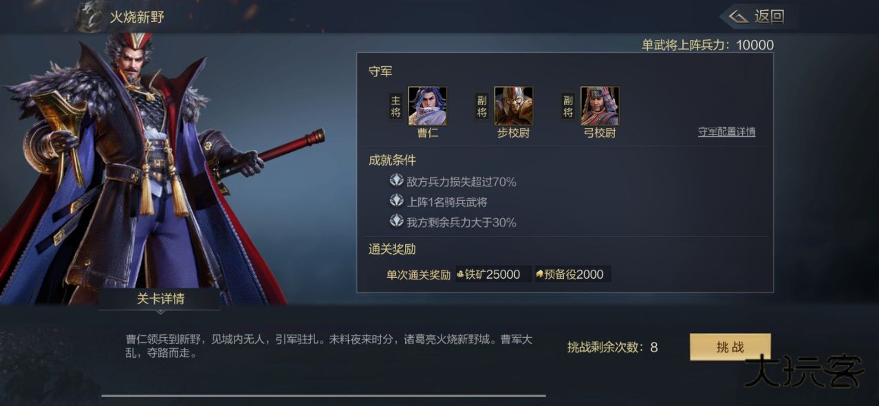 玩家可以在本玩法中体验到三国中的经典战役,并进行战斗。每一关有不同的成就需要玩家使用特定的武将或者阵容挑战完成。
