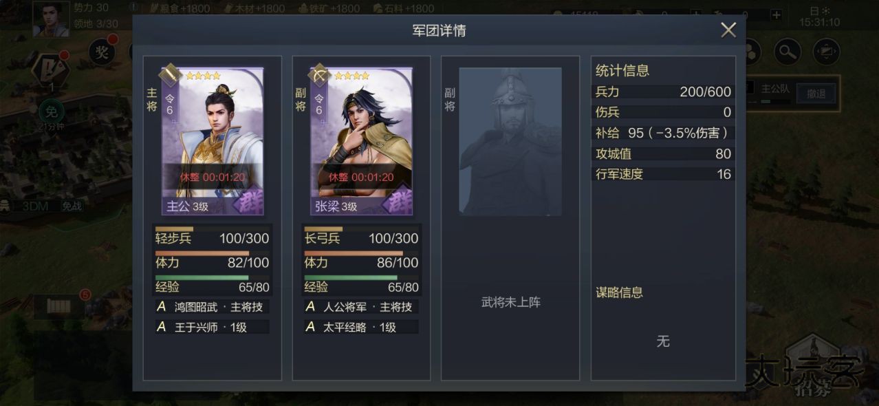 此时该军团在休整结束前不可攻占其它资源地块,但可以返回大营。军团位于大营中时,可以在配置界面快速分配兵力和调整阵容等,而预备兵源需要在城建中的征兵中花费资源获取,在征召期间会源源不断地获取兵源。