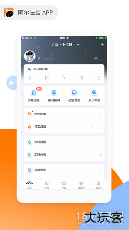 5、《阿尔法蛋》app是一款早教教育智能机器人硬件配套的应用,用户可以通过软件来对机器人进行远程操控、一键唤醒、语音互动,视频通话等等,还具有完善的监控保护,童话故事、儿歌、诗词歌赋、智慧数学、趣味英语等板块应有尽有,陪伴孩子玩耍也教会孩子知识,既是孩子的老师又是孩子的伙伴