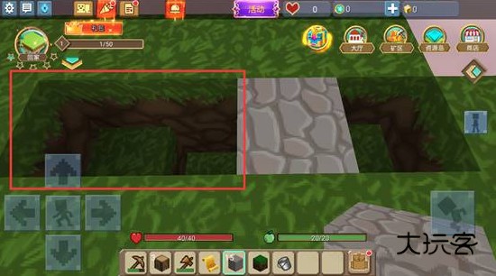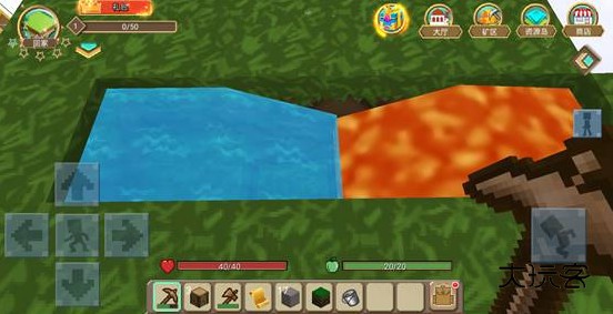 首先我们如图挖几个坑,左边的坑是用来放水的,右边的坑是用来放岩浆,划重点:左边的坑第2个格子向下挖2块土地,这样会形成一个阶梯,水会向下流动!