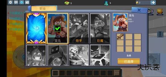 进入游戏后,我们可以对自身的职业进行选择,不同职业拥有的道具是不一样的,刚开始我们只能选择菜鸟职业,其他职业需要解锁才能使用。