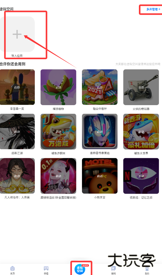 2、软件核心功能之一是“虚拟空间”,可通过“导入应用”将移动端游戏装入其中,实现多开或隔离运行,下方还推荐了多款如《海燕江湖》、《捕鱼炸翻天》等热门游戏便于直接体验。