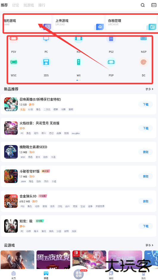 3、软件还集成了多平台模拟器支持,图标区展示了PSP、3DS、PS2等众多主机标志,意味着能够在移动设备上体验这些平台的经典游戏,并伴有社区讨论与存档服务。