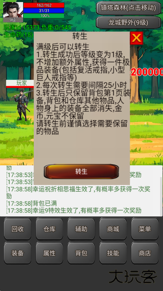 满级后24小时后可转生,转生后等级为1,只保留背包第一页装备,仓库人物身上和仓库金币药品技能全部清空,所以钱多的不考虑转生花完再转(至于转生给的小极品纯靠运气,除了给一次型的复活戒其他基本都是赚),转生元宝和双倍时间不会消失。(记得转生前一定把身上的极品脱下来放到背包第一页)新版本26级转生必给巨人特戒