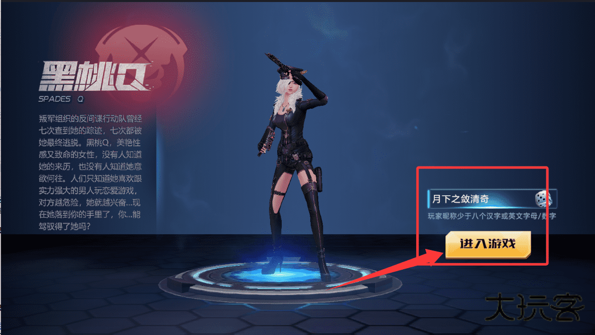 2、进入角色创建界面,为游戏角色设定名称,长度需限制在八个字符内。初始剧情引入核心人物黑桃Q,她作为背景复杂的致命角色,将与您展开一系列充满策略与交互的故事线。