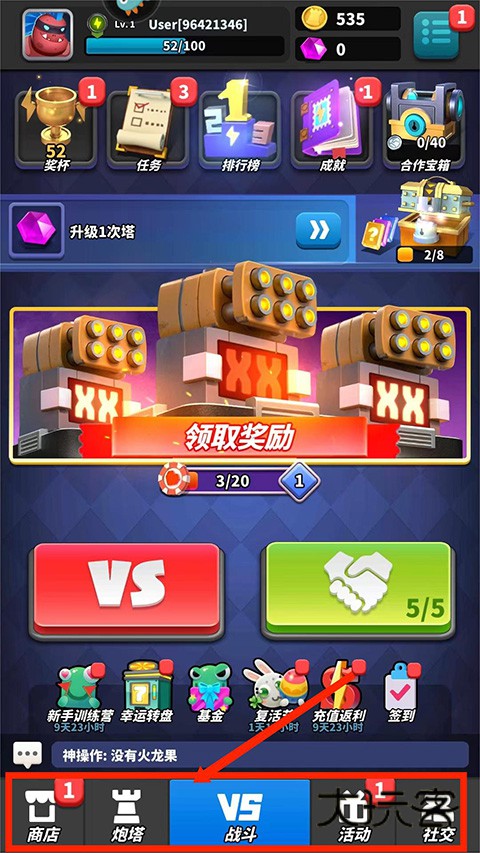 1、打开僵尸风暴游戏,进入游戏主界面,分为【商店】、【炮塔】、【战斗】、【活动】和【社交】栏目,