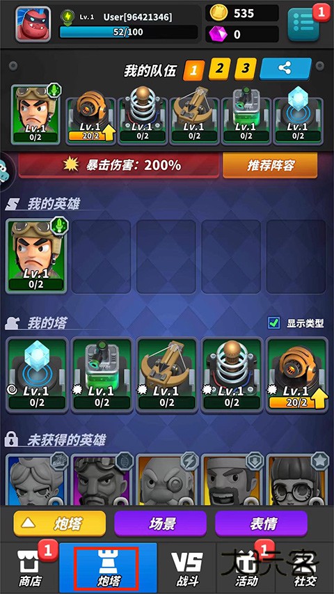 3、进入【炮塔界面】,玩家在这里可以搭配自己的阵容,了解自己的英雄,升级自己的塔以及管理场景和表情,