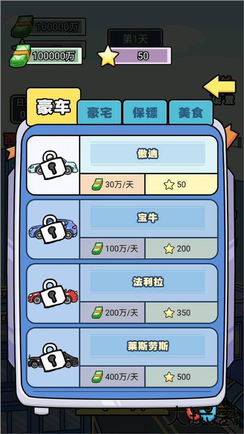 2、首日基础消费包含四项:购置豪华载具、购入顶级房产、雇佣安保团队、体验珍馐美馔;