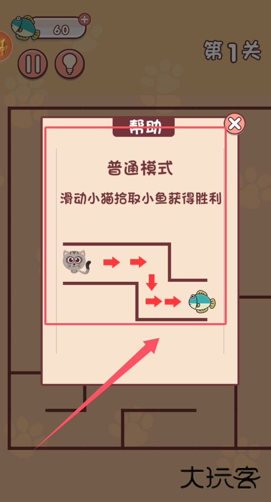 3、选择普通模式后,就来到了具体关卡,例如第1关。游戏目标通常很明确,比如滑动屏幕控制小猫移动。