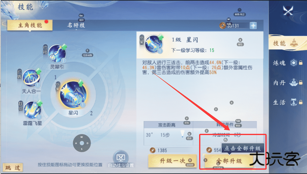 1、比如看到“星闪”技能,点击“升级一次”或“全部升级”就能增强伤害,记得留意下一级的学习等级要求哦。