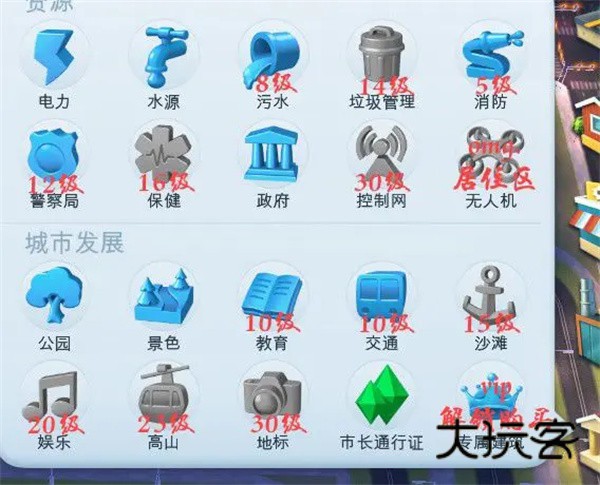 这些设施我都标记了解锁等级或者条件,水电是开局就会解锁的。