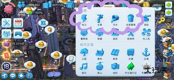 提升人口,可以用解锁的公园设施提升人口,这也是这个游戏的核心玩法之一,单纯靠建筑本身是没多少人口的。所以我们需要花金币购买公园设施来提升人口,最多提升100%,也就是说一栋房1836人,提升100%后就有3672人口。