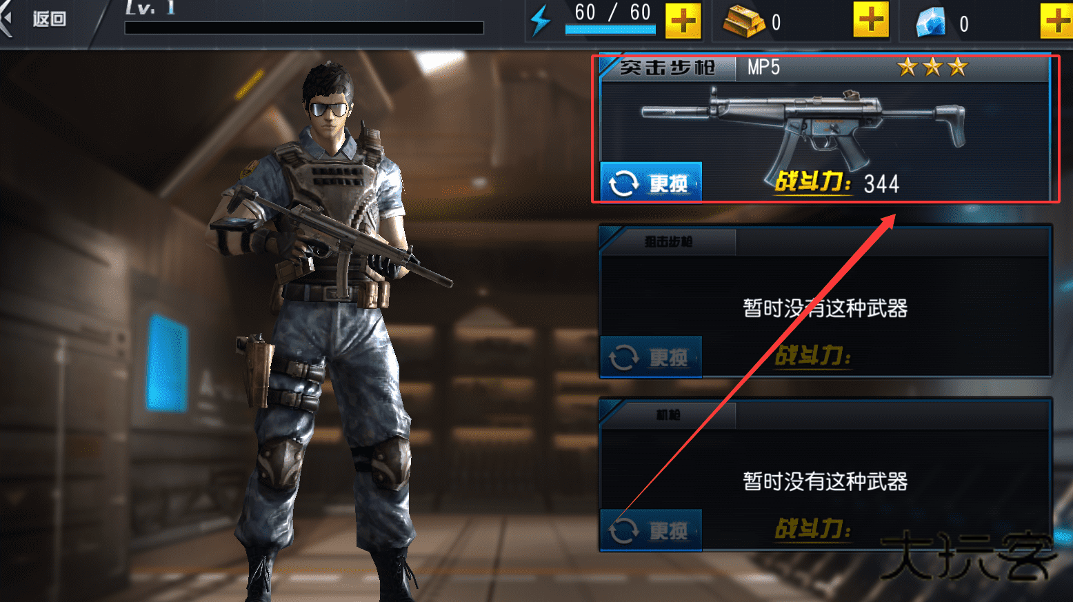 1、从第一张图片可以看到游戏内的武器与角色界面,上面显示了mp5突击步。