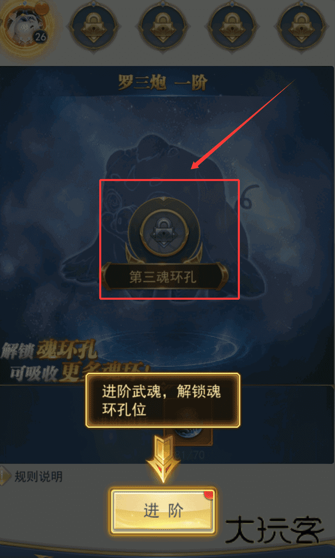 2、比如收集武魂“罗三炮”并进阶,就能解锁魂环孔并吸收“鬼藤”等魂技来增强实力。