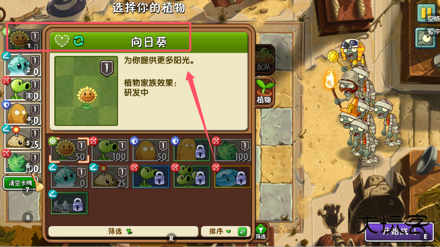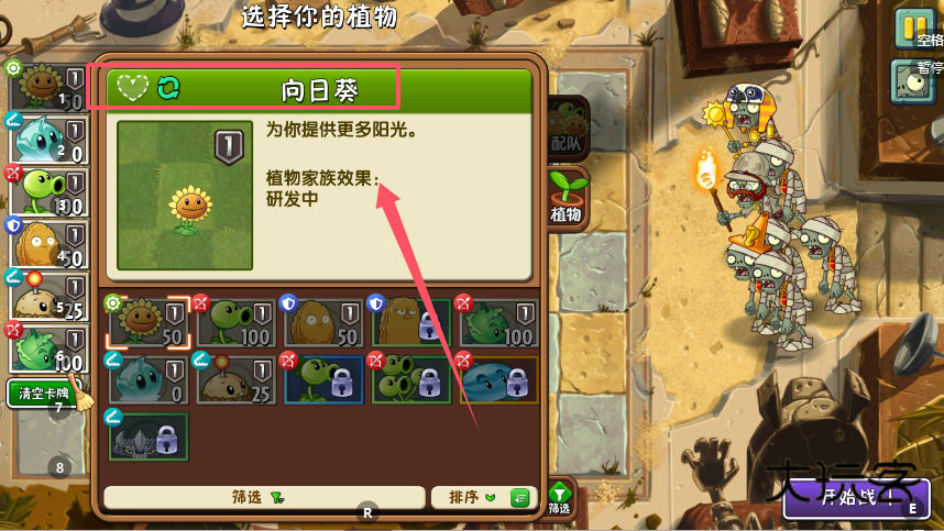 2、“选择你的植物”标题旁设有灵活的筛选工具,左侧参数区明确列出阳光消耗等战斗数据,帮助快速组建相克阵容,这套智能系统让战术搭配变得既有条理又快捷。