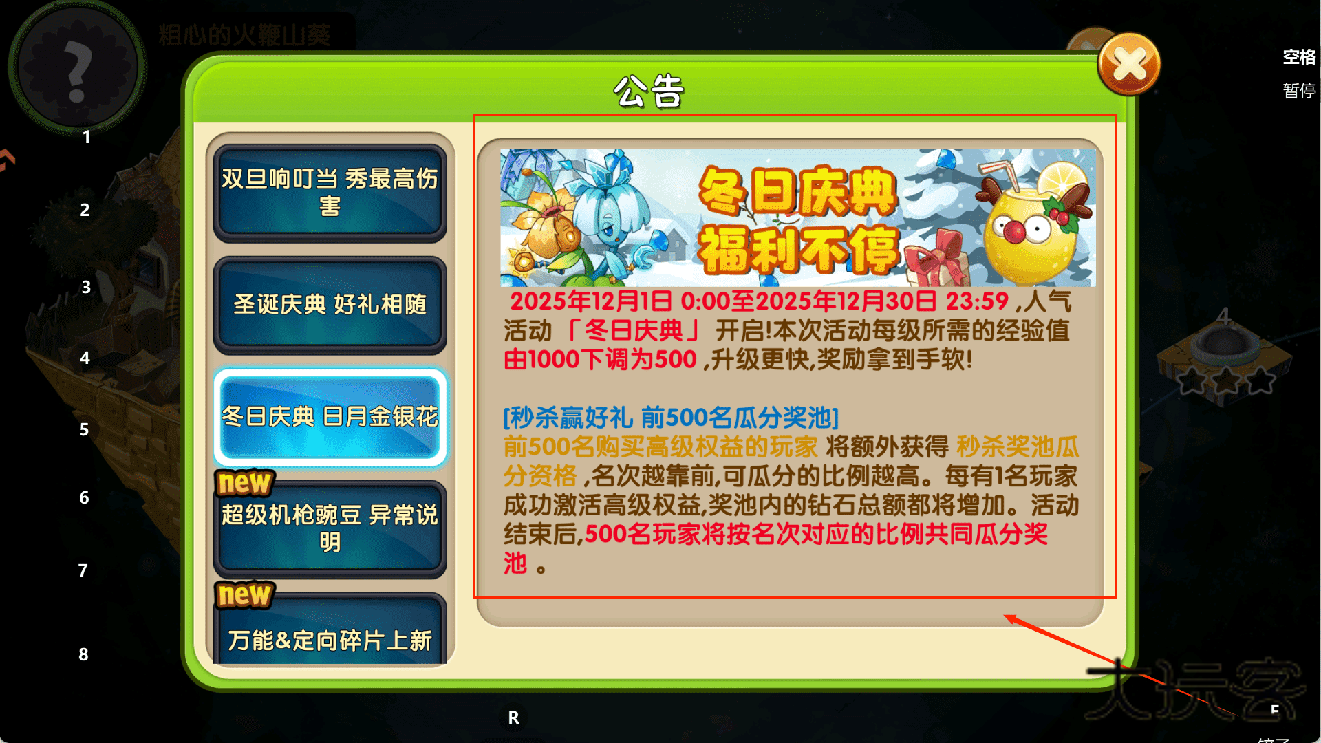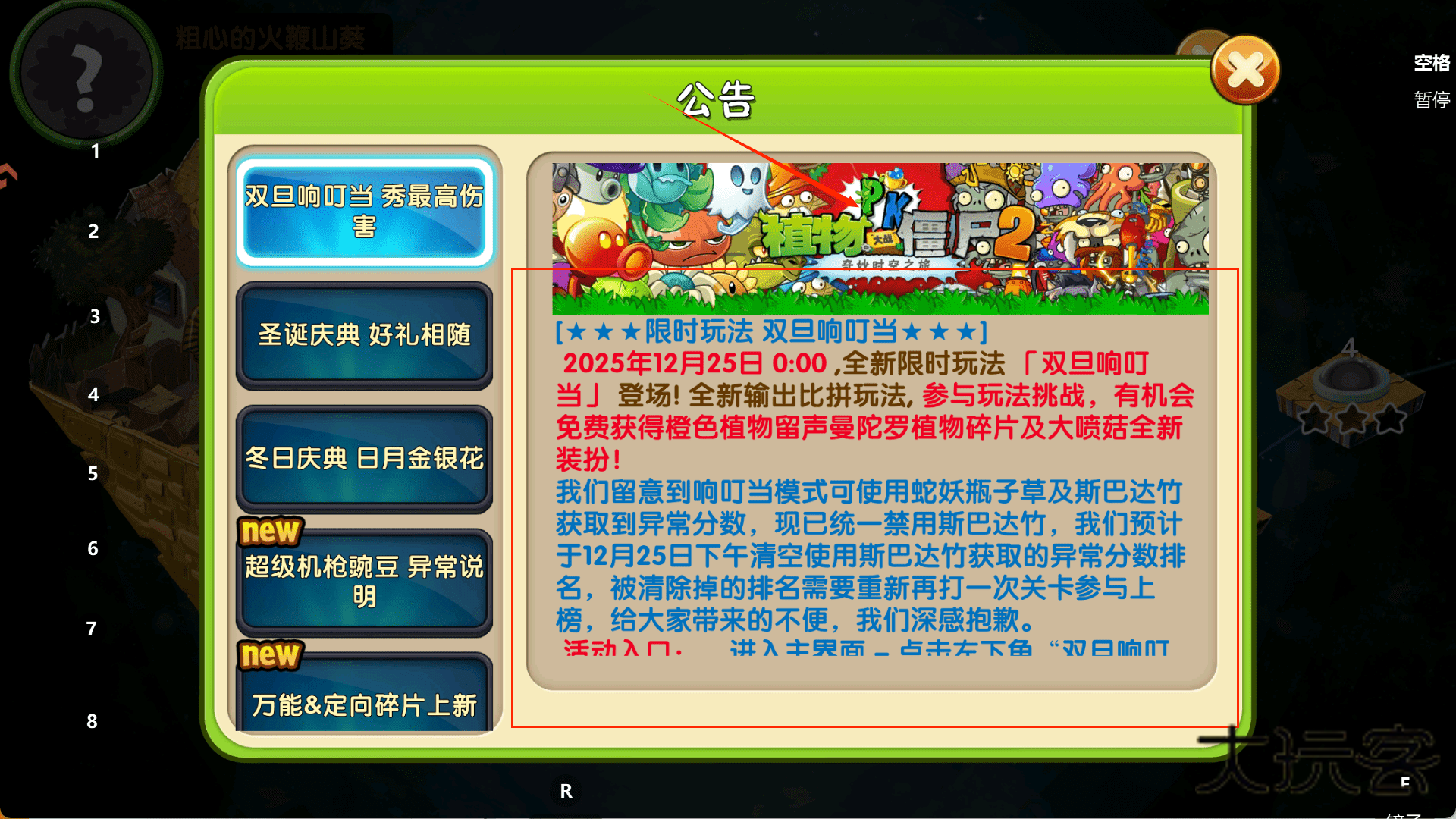 1、先把游戏更新到最新的3.9.4版本,然后在“公告”里找到“圣诞回归季”的入口,点进去就能看到“叶子保护伞”等经典老朋友带着新能力回来了。