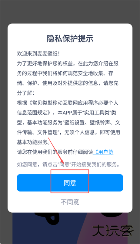 1、打开麦麦壁纸APP后会弹出隐私保护提示点击同意进入主界面,点击同意即可进入软件主界面浏览各种功能和资源内容。