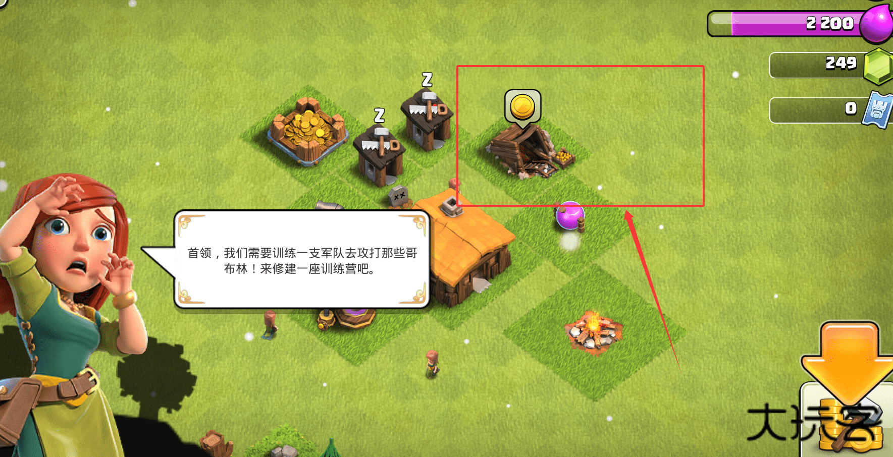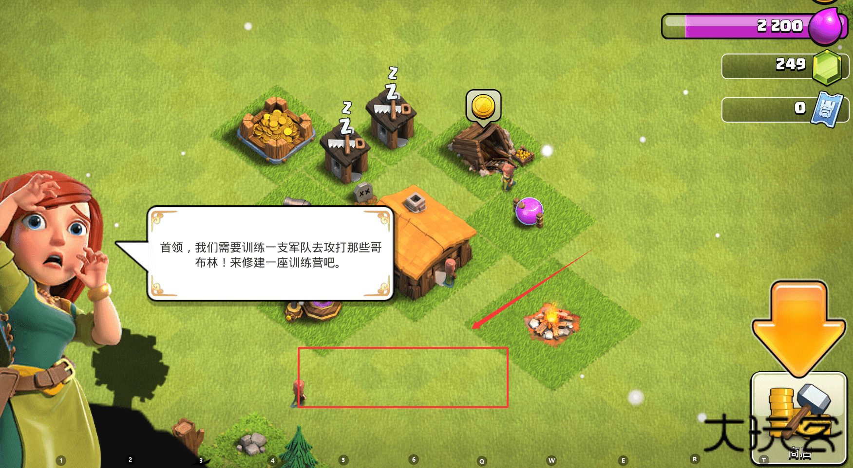 2、屏幕上可能会出现一个锤子或建造图标。点击那个图标,在弹出的建筑菜单中,选择“训练营”或类似的兵营类建筑选项。