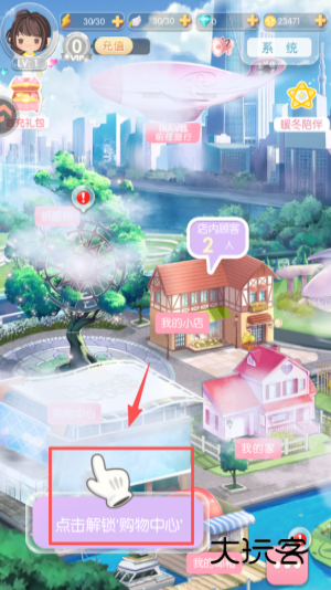 3、在主场景里找到 “点击解锁购物中心” 的提示区域,点击该区域,即可触发购物中心的解锁流程。