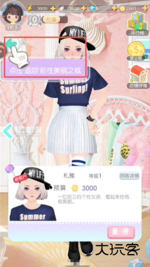 2、进入店铺后,看到 “点击返回前往美丽之城” 的提示,点击对应的返回按钮,就能回到主场景。