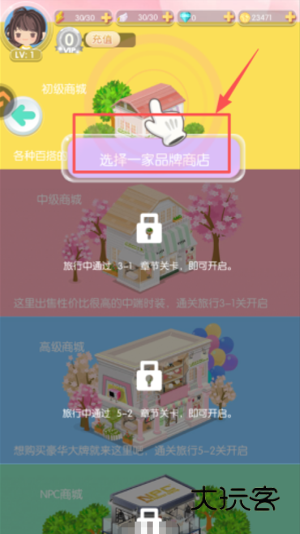 1、在界面中找到 “选择一家品牌商店” 的提示区域,点击对应的商店建筑,即可进入该店铺界面。
