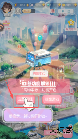 4、解锁购物中心后,界面会弹出 “立即前往” 按钮,点击这个按钮,就能直接进入购物中心界面。