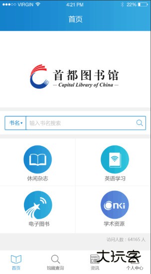 2、首都图书馆是首都图书馆官方手机客户端应用,软件拥有馆藏查询、资讯公告、休闲杂志、英语学习、电子图书、学术资源等等功能服务