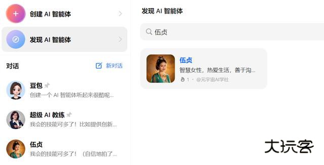 打开豆包,点击“发现智能体”,搜索“伍贞”,撩吧