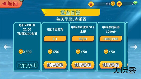 9.在这里玩家可以领取丰厚的奖励,不仅可以对鲨鱼进行装装备,还可以解锁其他模式,除此之外,游戏中还有很多玩法等着玩家们自行下载体验。