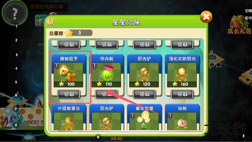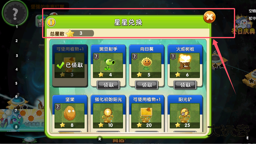 2、在星星兑换页面,查看总星数和每个道具所需的星星,比如“火炬树桩”需要6颗星星,当星数满足要求时,点击道具下方的“领取”按钮,就能获取对应的植物道具。