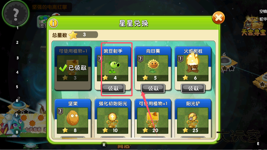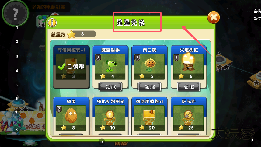 2、在星星兑换页面,查看总星数与各道具所需星星,比如“可使用植物+1”需3颗星星,满足数量条件后点击道具下方的“领取”按钮,即可获得对应的植物或功能权益。