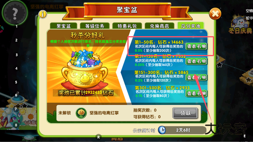 1、打开聚宝盆的瓜分奖池页面,了解名次对应的钻石奖励比例,通过增加抽奖次数提升排名,例如前50名可获得奖池0.5%的钻石,需至少抽奖200次才能参与该区间奖励瓜分。