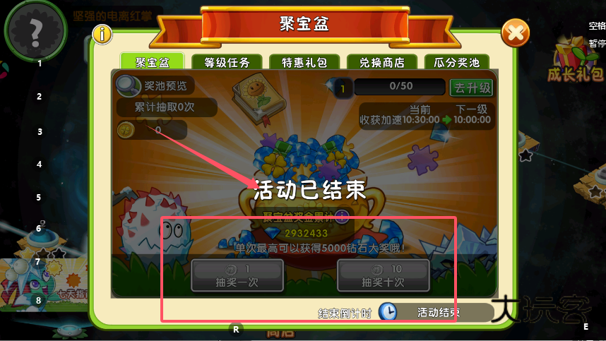 2、在聚宝盆抽奖界面,点击“抽奖一次”或“抽奖十次”积累次数,这些次数会直接关联瓜分奖池的排名,同时抽奖过程中可能触发单次最高5000钻石的大奖,奖池累计金额会持续更新。