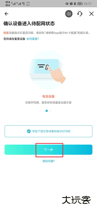 3、按照提示将设备插电开机并在听到提示音后,点击下一步
