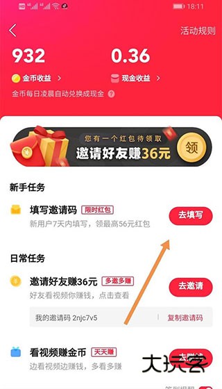 3、点击填写邀请码一栏后的“去填写”;