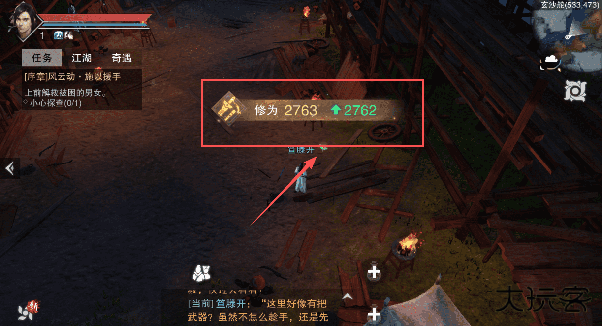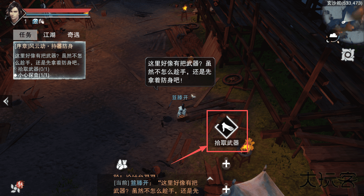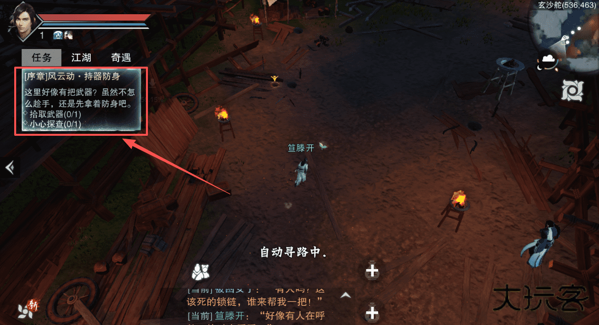2、打开任务界面找到序章任务,像拾取武器,根据提示前往玄沙舵指定坐标。