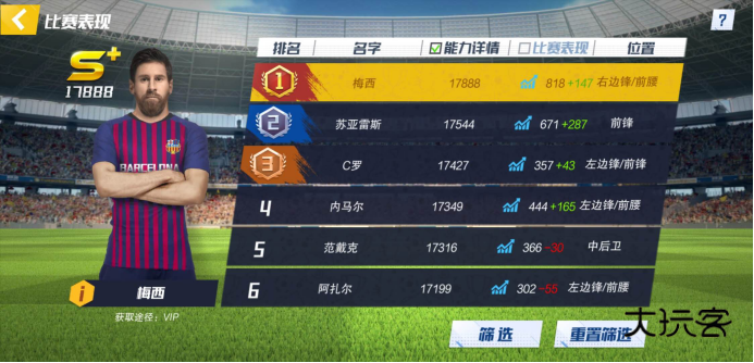 接下来着重说说培养重心,所谓培养重心呢就是把大部分材料都给这位球员,让他快速升级毕业,大家可以点击球队名字下面的图标,点进去看每个球员的能力,内马尔>魔笛(博格巴)>瓦拉内>布斯克茨,为什么说内马尔摆在首位,因为他是能力仅次于梅罗苏亚雷斯的锋线球员,而魔笛(博格巴)同理,瓦拉内的获取时间短,能力高,技能好,也是阵容里为数不多能快速满星的球员,布斯克茨也是如此,只不过获取时间非常长(奥斯卡影帝果然需要时间锤炼)
