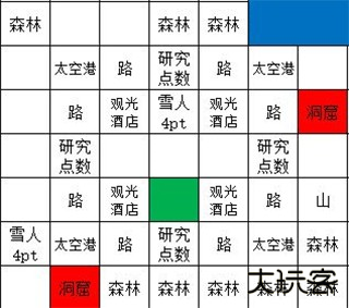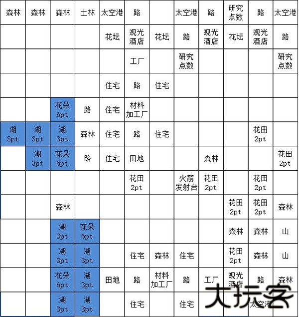 2.参照图示完成建筑物布局。制造火箭招募人员,优先筛选研究点数消耗低的选项。高体力成员用于区域探索,低体力成员安排至生产岗位。