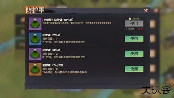 保护罩时长现有 2 小时、8 小时及 24 小时三类。游戏系统会随时间累积提供免费保护罩使用次数,在避难所资源充足且暂时无紧急用途时,可考虑开启保护罩。